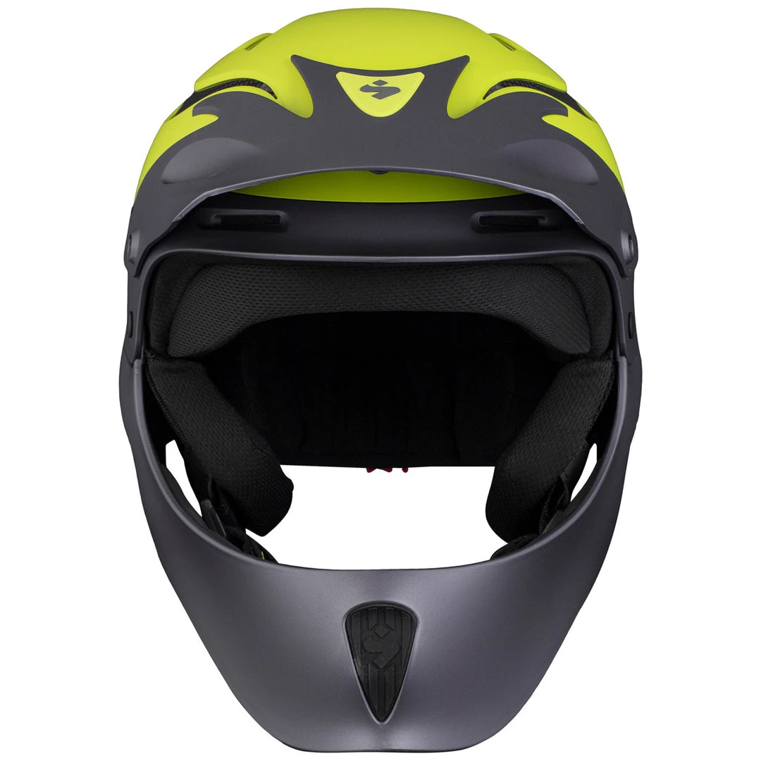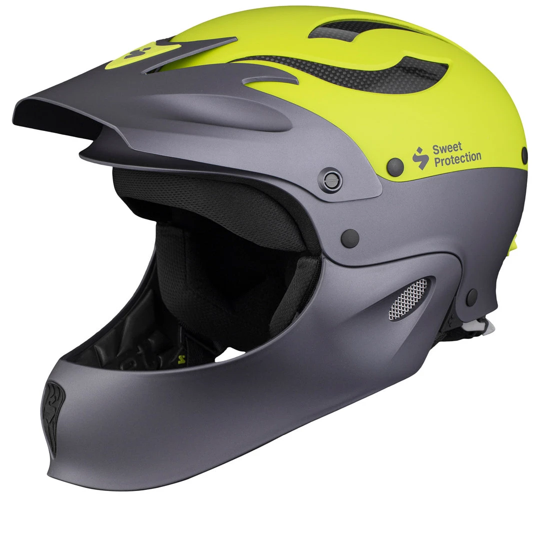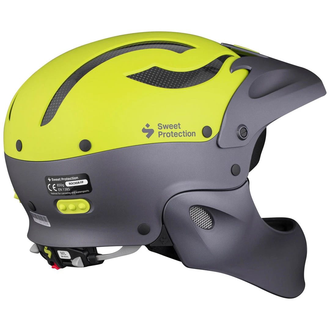 The Sweet Rocker Full Face whitewater kayak helmet, the best full coverage helmet on the market today, with the most extensive protection available. It has all the amazing Rocker features, but with an added a low profile composite jaw guard that prevents you from emptying your pockets for new teeth when shit happens. The unique jaw guard construction flexes under great loads to reduce the forces applied to the neck.